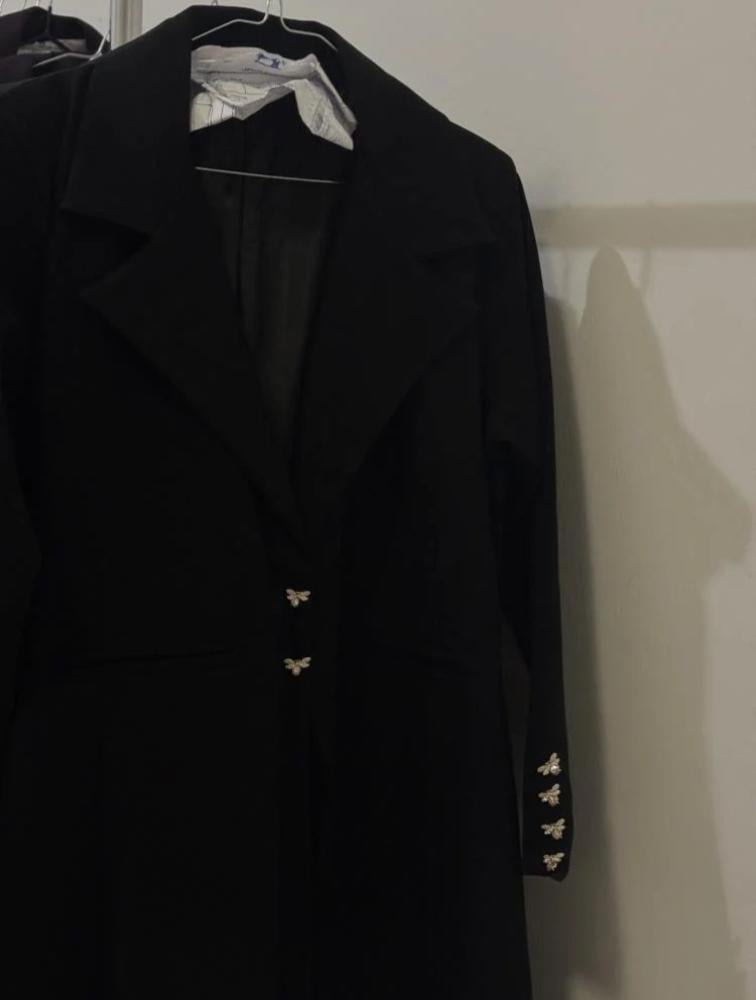 تفاصيل العباية: بليزر عبايه جيوب من الامام ، الاكمام مزينه بفراشات ذهبي ومن الامام ايضاً ، من الخلف فتحه صغيره .