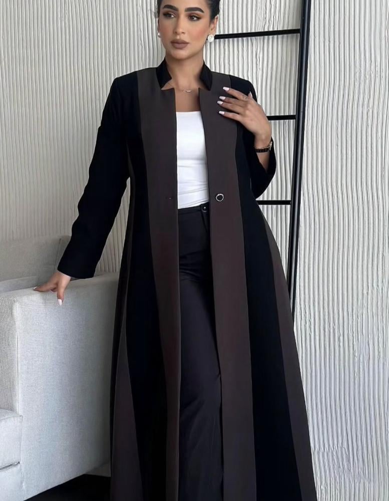 عباية بلونين أسود وبني راقي، قصّة مفتوحة مع ياقة ستايل، قماشها ناعم وواقف تعطيك فخامة وأناقة تناسب دوامك ومناسباتك✨